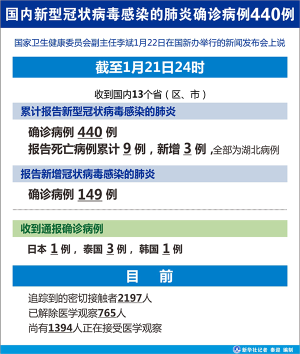 截至1月21日24時,國家衛(wèi)健委收到國內13個省(區(qū)、市)累計報告新型冠狀病毒感染的肺炎確診病例440例,報告死亡病例累計9例,新增3例,全部為湖北病例。