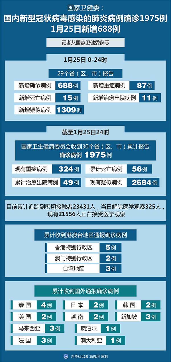 圖表:國家衛(wèi)健委:國內(nèi)新型冠狀病毒感染的肺炎病例確診1975例 1月25日新增688例 新華社記者 施鰻珂 編制