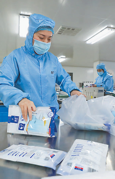 近日,各地口罩生產(chǎn)企業(yè)抓緊生產(chǎn),全力增加市場供應(yīng)。圖為浙江省德清縣一家口罩企業(yè)生產(chǎn)車間,工作人員在包裝口罩。王正 王玨 攝影報(bào)道(影像中國)