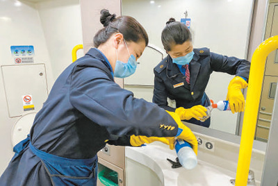 為應(yīng)對疫情,鐵路部門全力做好相關(guān)防控工作。圖為南昌開往南京的G1496次列車上,南昌客運(yùn)段工作人員認(rèn)真做好車廂清潔、消毒工作。鮑贛生 攝(人民視覺)