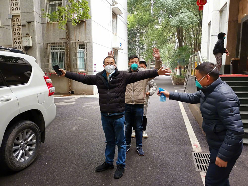 ↑ 2020年1月23日,新華社記者采訪結(jié)束后,用酒精進(jìn)行人車消毒。