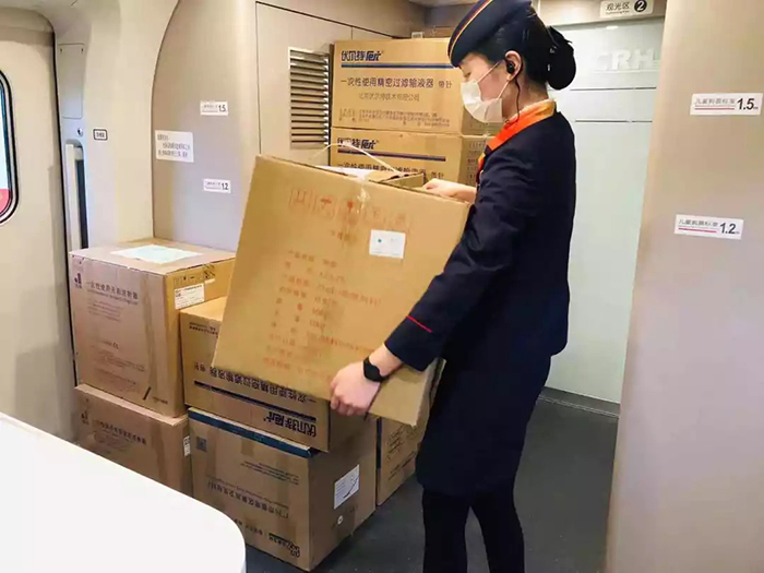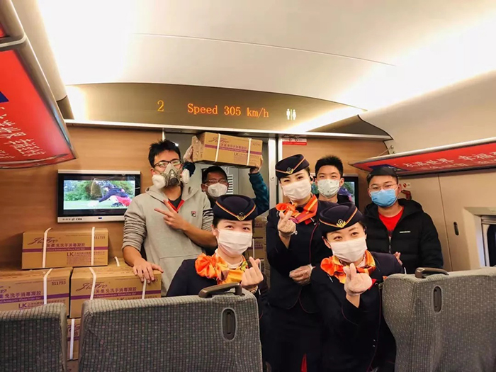 當(dāng)天下午,列車從鄭州東站返回廣州南站時,又接到一批特殊的禮物。中國鐵路鄭州局有限公司防控所支援武漢的醫(yī)療物資,搭乘高鐵車遞到武漢站。幾名旅客看到乘務(wù)員姑娘們忙碌地搬運(yùn)這些大箱子,都自告奮勇奮前來幫忙,大家齊心協(xié)力,不一會兒就把全部物資搬運(yùn)上車。列車載著這些愛心物資,迅速送達(dá)武漢。