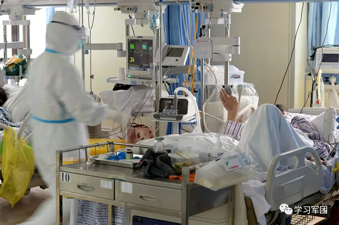 1月27日上午,海軍軍醫(yī)大學(xué)醫(yī)療隊(duì)醫(yī)護(hù)人員在漢口醫(yī)院重癥監(jiān)護(hù)室對(duì)新型冠狀病毒感染的肺炎患者進(jìn)行救治。醫(yī)護(hù)人員迅速回應(yīng)患者呼喚。解放軍報(bào)記者范顯海攝