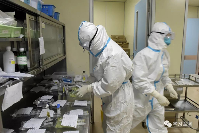 1月27日上午,海軍軍醫(yī)大學(xué)醫(yī)療隊(duì)醫(yī)護(hù)人員在漢口醫(yī)院重癥監(jiān)護(hù)室對(duì)新型冠狀病毒感染的肺炎患者進(jìn)行救治。醫(yī)護(hù)人員配備藥品。解放軍報(bào)記者范顯海攝