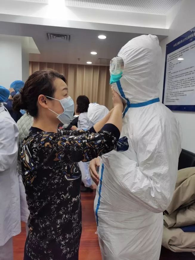 (圖說:出發(fā)前,首都醫(yī)科大學宣武醫(yī)院在全員培訓的基礎上,對醫(yī)護人員進行穿脫防護服等感染防控加強培訓。在現(xiàn)場,首都醫(yī)科大學宣武醫(yī)院呼吸科副主任醫(yī)師肖漢(右),他的愛人北京醫(yī)院醫(yī)務處副處長潘琪(左)正在用自己的專業(yè)知識,幫助丈夫規(guī)范穿戴防護服。)