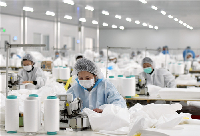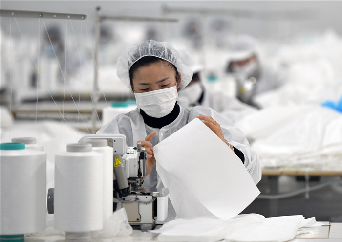 1月28日,在仙桃市湖北裕民防護(hù)用品有限公司生產(chǎn)車間內(nèi),工人在加緊生產(chǎn)醫(yī)用防護(hù)用品。 新華社記者 李賀 攝