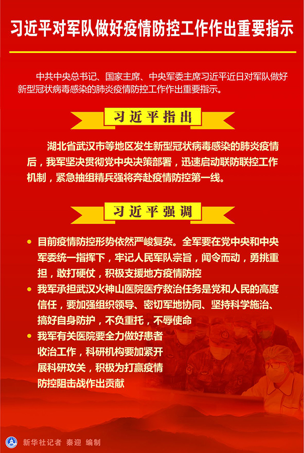 習(xí)近平指出,湖北省武漢市等地區(qū)發(fā)生新型冠狀病毒感染的肺炎疫情后,我軍堅(jiān)決貫徹黨中央決策部署,迅速啟動(dòng)聯(lián)防聯(lián)控工作機(jī)制,緊急抽組精兵強(qiáng)將奔赴疫情防控第一線。