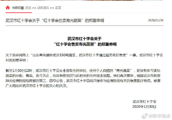 辟謠!“武漢紅十字會售賣壽光蔬菜”不屬實-新華網