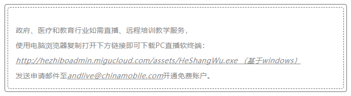 中國移動教育名師直播課堂免費提供在線課程學習和遠程直播教學平臺,掃碼可領取可免費課程資源,使用直播能力可撥打4001100868。中國移動企業(yè)和商務直播為政府、醫(yī)療和教育行業(yè)提供直播、遠程培訓教學服務,符合條件的用戶可使用直播普及疫情防控知識,或使用電腦進行遠程培訓教學等。