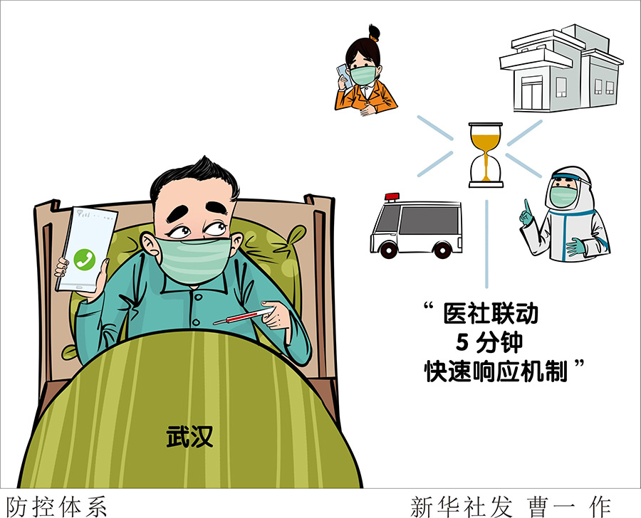武漢青山區(qū)鋼花村街110社區(qū)書記馮丹介紹稱,鋼花村街制定了“醫(yī)社聯(lián)動(dòng)5分鐘快速響應(yīng)機(jī)制”:遇到有居民反映相關(guān)癥狀時(shí),社區(qū)工作人員第一時(shí)間通報(bào)社區(qū)衛(wèi)生服務(wù)中心,值班醫(yī)生5分鐘內(nèi)電話聯(lián)系疑似患者或家屬,作出是否需要上門診斷或轉(zhuǎn)診的預(yù)判,并反饋社區(qū);醫(yī)生判斷不需上門的,由社區(qū)網(wǎng)格員指導(dǎo)居民居家觀察;醫(yī)生判斷需要上門的,則由社區(qū)申請(qǐng)應(yīng)急車,先到社區(qū)衛(wèi)生服務(wù)中心接醫(yī)護(hù)人員,再會(huì)同社區(qū)工作者上門,將患者及醫(yī)護(hù)人員送往發(fā)熱門診。