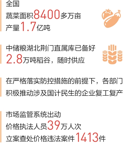 連日來,各部門積極組織蔬菜等副食品生產(chǎn),確保蔬菜、肉蛋奶、糧食等居民生活必需品供應(yīng),加強(qiáng)統(tǒng)籌協(xié)調(diào),保障煤電油氣供應(yīng)。同時,依法嚴(yán)厲打擊利用疫情哄抬物價(jià)、囤積居奇、趁火打劫等擾亂社會秩序的違法犯罪行為。目前,全國生活必需品市場供應(yīng)總體充足、價(jià)格穩(wěn)定。全國路網(wǎng)保障和運(yùn)行良好,物資運(yùn)輸整體有序。