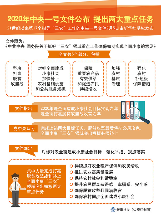 文件確定,對(duì)標(biāo)對(duì)表全面建成小康社會(huì)目標(biāo),強(qiáng)化舉措、狠抓落實(shí),集中力量完成打贏脫貧攻堅(jiān)戰(zhàn)和補(bǔ)上全面小康“三農(nóng)”領(lǐng)域突出短板兩大重點(diǎn)任務(wù),持續(xù)抓好農(nóng)業(yè)穩(wěn)產(chǎn)保供和農(nóng)民增收,推進(jìn)農(nóng)業(yè)高質(zhì)量發(fā)展,保持農(nóng)村社會(huì)和諧穩(wěn)定,提升農(nóng)民群眾獲得感、幸福感、安全感,確保脫貧攻堅(jiān)戰(zhàn)圓滿收官,確保農(nóng)村同步全面建成小康社會(huì)。