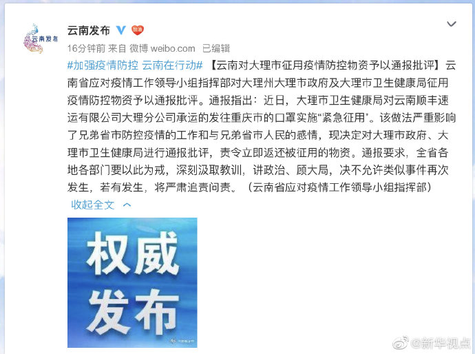 通報指出:近日,大理市衛(wèi)生健康局對云南順豐速運有限公司大理分公司承運的發(fā)往重慶市的口罩實施“緊急征用”。該做法嚴(yán)重影響了兄弟省市防控疫情的工作和與兄弟省市人民的感情,現(xiàn)決定對大理市政府、大理市衛(wèi)生健康局進行通報批評,責(zé)令立即返還被征用的物資。通報要求,全省各地各部門要以此為戒,深刻汲取教訓(xùn),講政治、顧大局,決不允許類似事件再次發(fā)生,若有發(fā)生,將嚴(yán)肅追責(zé)問責(zé)。