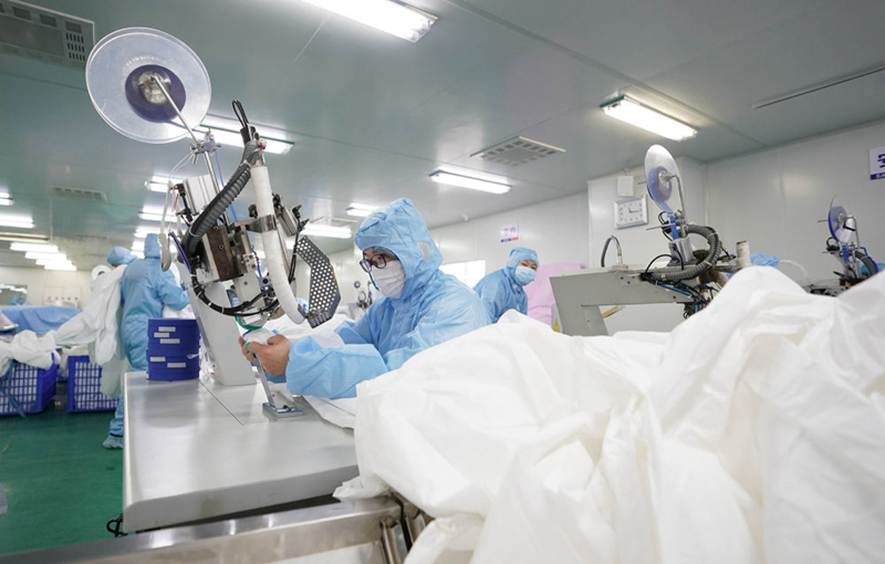 1月28日,在武漢市新洲區(qū)武漢協(xié)卓衛(wèi)生用品有限公司,工人在趕制防護(hù)服。