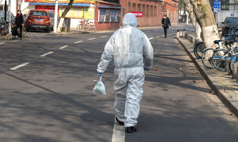 2月5日,武漢市江岸區(qū)永清街道吉林社區(qū)工作人員張敏為老伴住院的獨(dú)居老人送藥。