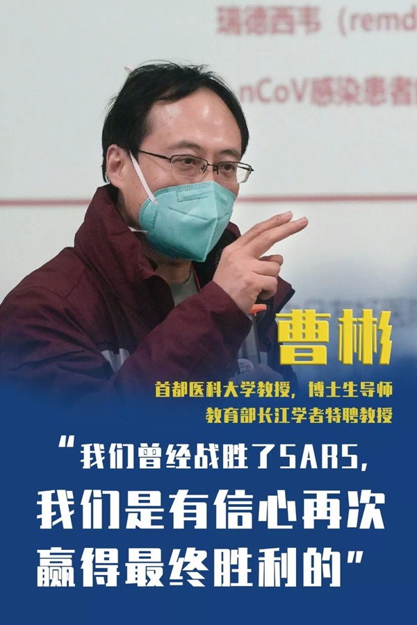 首都醫(yī)科大學(xué)教授、博士生導(dǎo)師,教育部長(zhǎng)江學(xué)者特聘教授,中日友好醫(yī)院副院長(zhǎng)曹彬在疫情暴發(fā)前期就作為衛(wèi)健委特派專家多次奔赴武漢一線。當(dāng)他得知自己所屬的中日友好醫(yī)院將召集醫(yī)療隊(duì)共赴戰(zhàn)場(chǎng)時(shí),他在呼吸中心的微信群里發(fā)了這樣的信息:“我在武漢等你”。受他感召,中日友好醫(yī)院呼吸中心的同事們紛紛踴躍報(bào)名!