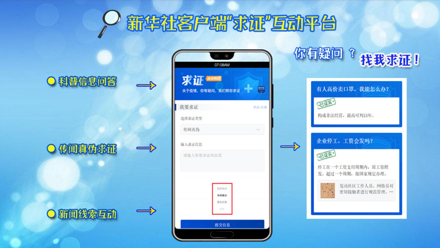 “求證”互動平臺設(shè)置“問答”“求證”“征集”三類服務(wù)功能。“問答”即科普答疑,“求證”即辨別消息真?zhèn)?,“征集”即匯總新聞線索。