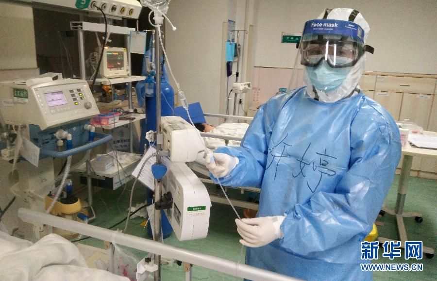 在武漢市第九醫(yī)院重癥監(jiān)護(hù)室,共產(chǎn)黨員、西安市胸科醫(yī)院ICU主管護(hù)師許婷在工作(2月1日攝)。 新華社發(fā)