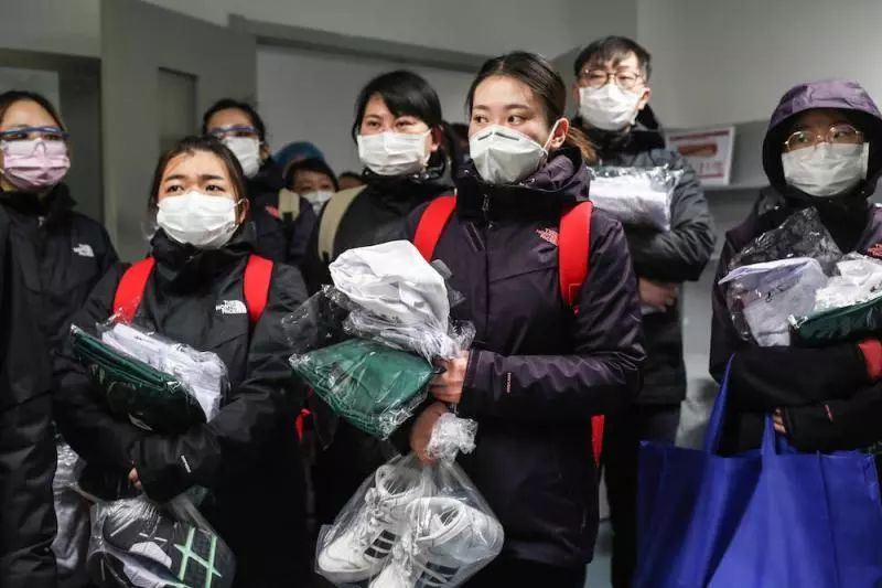 (在前往醫(yī)院前,隊(duì)員們?cè)隈v地領(lǐng)取病房工作服)