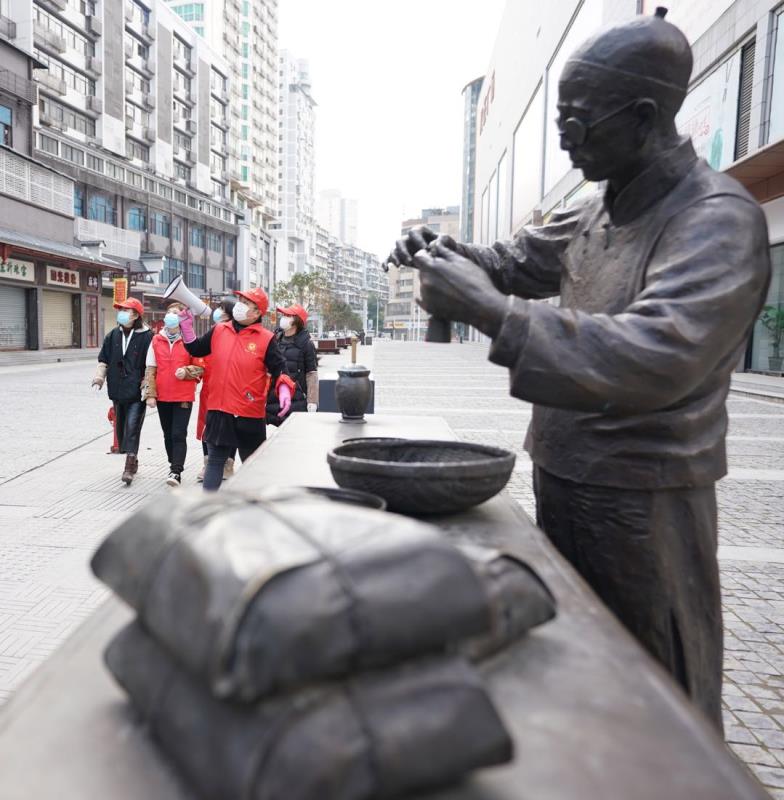 戰(zhàn)“疫”中的漢正街,看不到開門的商戶,很難想像高峰時(shí)漢正街的小商品綜合市場(chǎng)曾經(jīng)有60多個(gè)專業(yè)市場(chǎng)、30多萬(wàn)種商品。街頭行人不多,不時(shí)能看到街道、社區(qū)干部做宣傳或是為居民服務(wù)。胡亞非介紹說(shuō),漢正街轄區(qū)面積1.67平方公里,下轄19個(gè)社區(qū)。此次疫情開始正值春節(jié)之前,10多萬(wàn)流動(dòng)人口返鄉(xiāng),目前常住居民1000余戶,2.6萬(wàn)多人口。