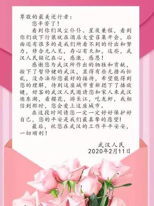不久,華山醫(yī)院醫(yī)療隊回復道:這次,武漢人民需要幫助,我們責無旁貸地來了,來幫上一把!大家齊心協(xié)力,共渡難關(guān)。期待春暖花開,一起逛東湖、看櫻花、游長江、吃龍蝦!