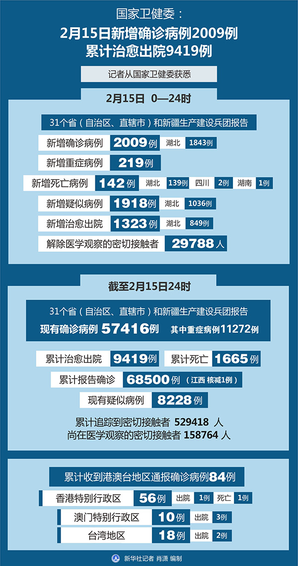 截至2月15日24時,據(jù)31個?。ㄗ灾螀^(qū)、直轄市)和新疆生產(chǎn)建設(shè)兵團報告,現(xiàn)有確診病例57416例(其中重癥病例11272例),累計治愈出院病例9419例,累計死亡病例1665例,累計報告確診病例68500例(江西省核減1例),現(xiàn)有疑似病例8228例。累計追蹤到密切接觸者529418人,尚在醫(yī)學(xué)觀察的密切接觸者158764人。
