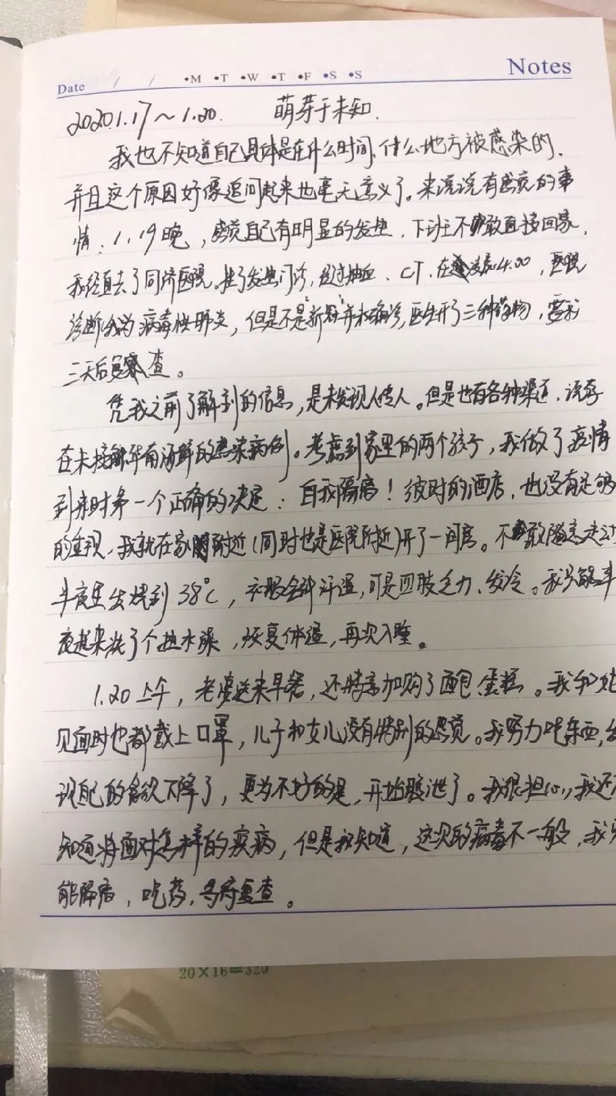 “1月20日—22日,第一次復(fù)查。食欲不振,發(fā)熱一陣一陣的,身體發(fā)虛,四肢無力,檢測結(jié)果為疑似病例,心中仍然忐忑,不知道自己的病情將走向何方?!?/p>