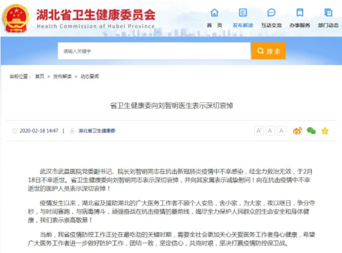 據(jù)湖北衛(wèi)健委網(wǎng)站消息,武漢市武昌醫(yī)院黨委副書記、院長劉智明同志在抗擊新冠肺炎疫情中不幸感染,經(jīng)全力救治無效,于2月18日不幸殉職,終年51歲。