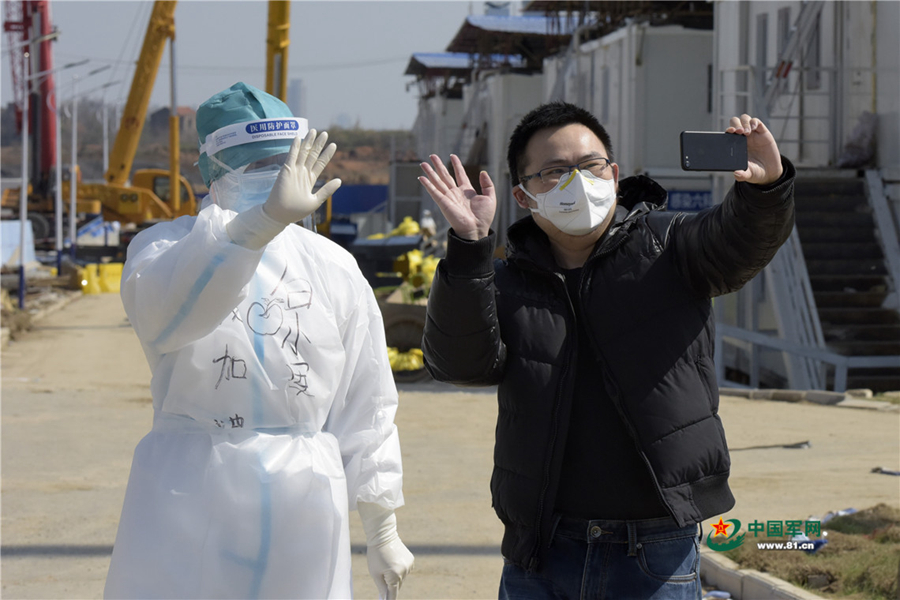 2月20日,治愈出院的萬先生錄制在火神山醫(yī)院的最后一條短視頻。中國(guó)軍網(wǎng)記者范顯海 攝