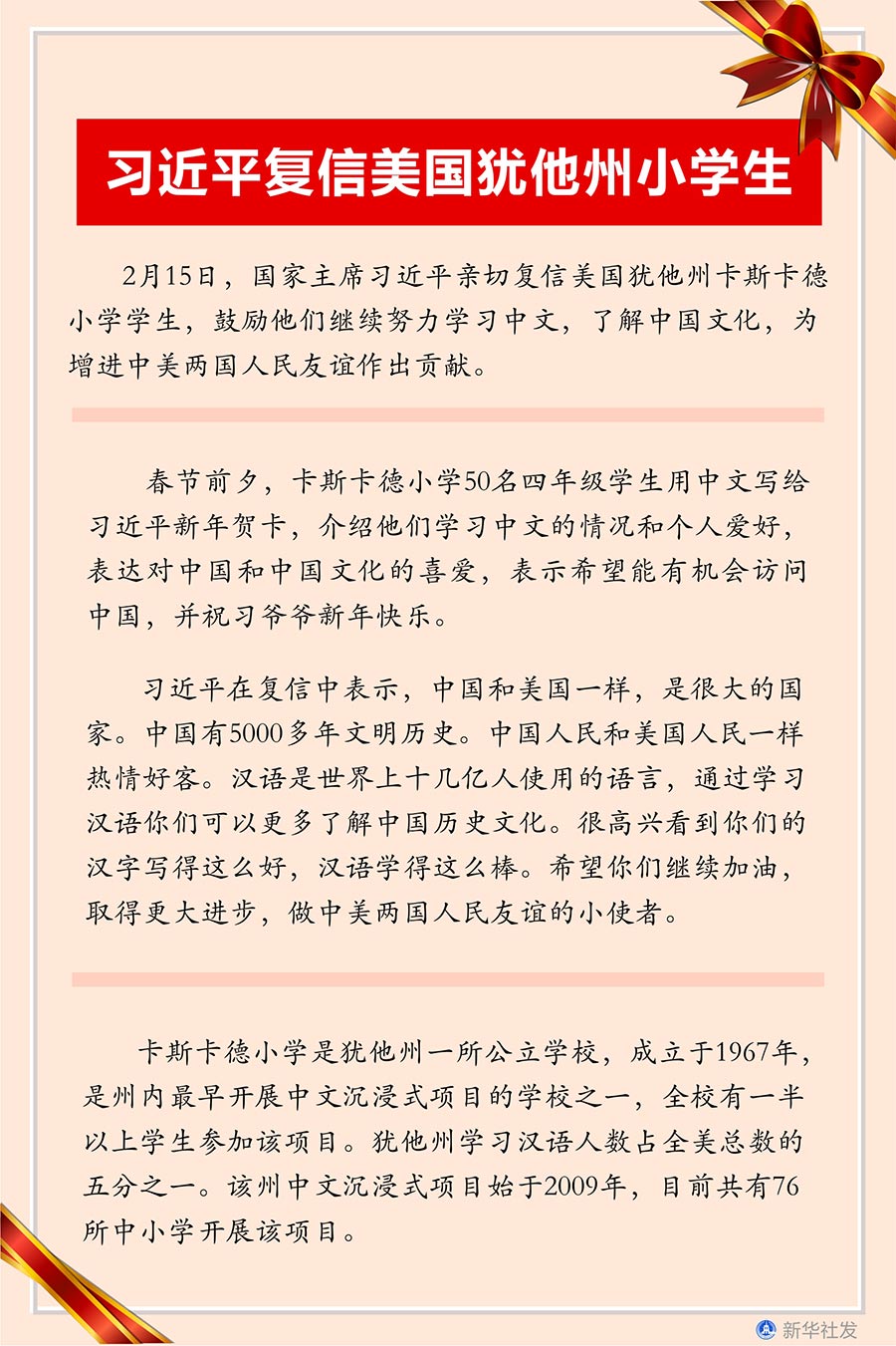 新華社北京2月22日電? 2月15日,國(guó)家主席習(xí)近平親切復(fù)信美國(guó)猶他州卡斯卡德小學(xué)學(xué)生,鼓勵(lì)他們繼續(xù)努力學(xué)習(xí)中文,了解中國(guó)文化,為增進(jìn)中美兩國(guó)人民友誼作出貢獻(xiàn)。