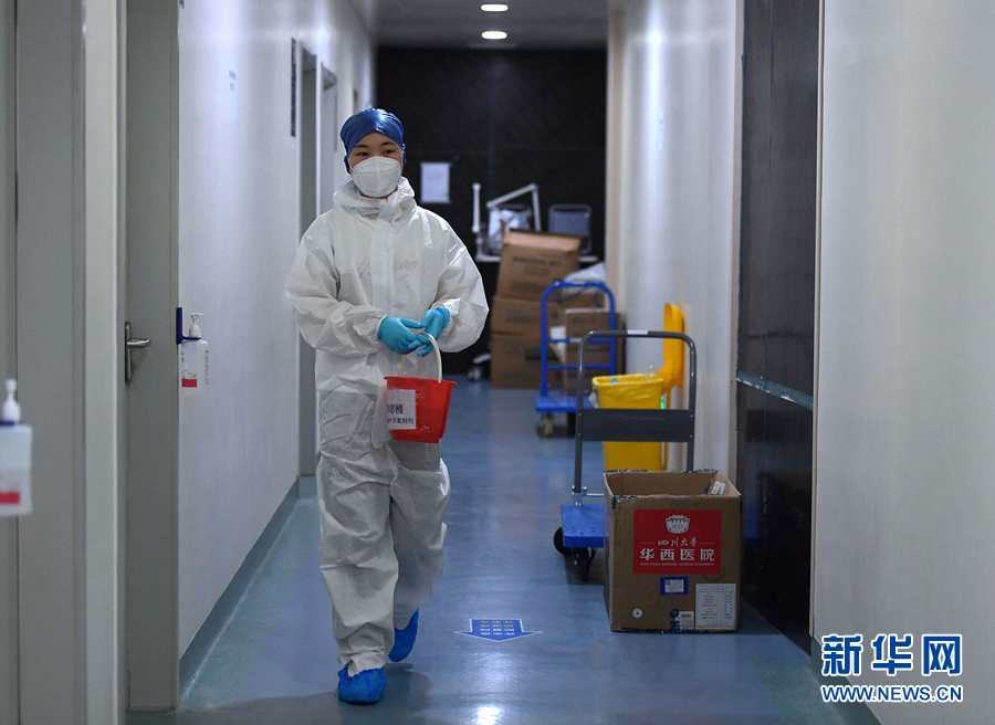 佘沙在湖北省人民醫(yī)院東院病區(qū)的清潔區(qū)打掃防護操作間(2月23日攝)。? 新華社記者李賀攝
