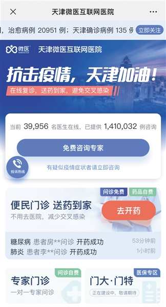 除針對新冠肺炎的免費義診之外,圍繞慢性病和常見病的便民門診、心理援助專區(qū)和醫(yī)護(hù)人員心理關(guān)懷通道也快速開通,天津微醫(yī)互聯(lián)網(wǎng)醫(yī)院率先成為天津抗擊疫情的“第二戰(zhàn)場”。