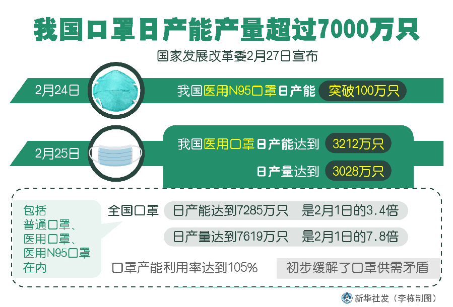 新華社北京2月27日電(記者安蓓)國家發(fā)展改革委27日宣布,繼2月24日我國醫(yī)用N95口罩日產(chǎn)能突破100萬只后,2月25日,我國醫(yī)用口罩日產(chǎn)能達到3212萬只,日產(chǎn)量達到3028萬只;包括普通口罩、醫(yī)用口罩、醫(yī)用N95口罩在內(nèi),全國口罩日產(chǎn)能達到7285萬只,日產(chǎn)量達到7619萬只,分別是2月1日的3.4倍、7.8倍,口罩產(chǎn)能利用率達到105%,初步緩解了口罩供需矛盾。