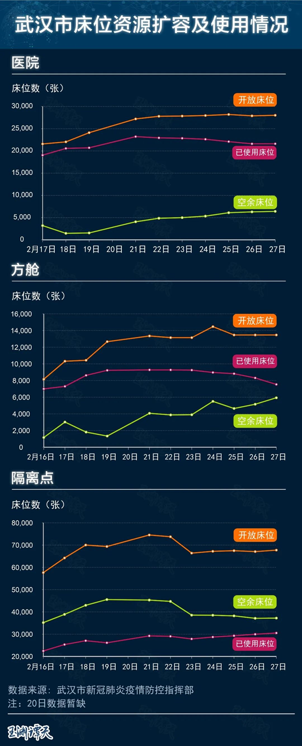 這是2月16日到27日之間,醫(yī)院、方艙和隔離點(diǎn)的床位數(shù)變化。