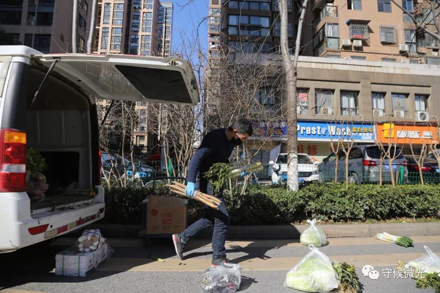 2月16日,湖北省武漢市,送菜小哥許可在為取單的小區(qū)居民擺放貨品。中國青年報 趙迪/攝