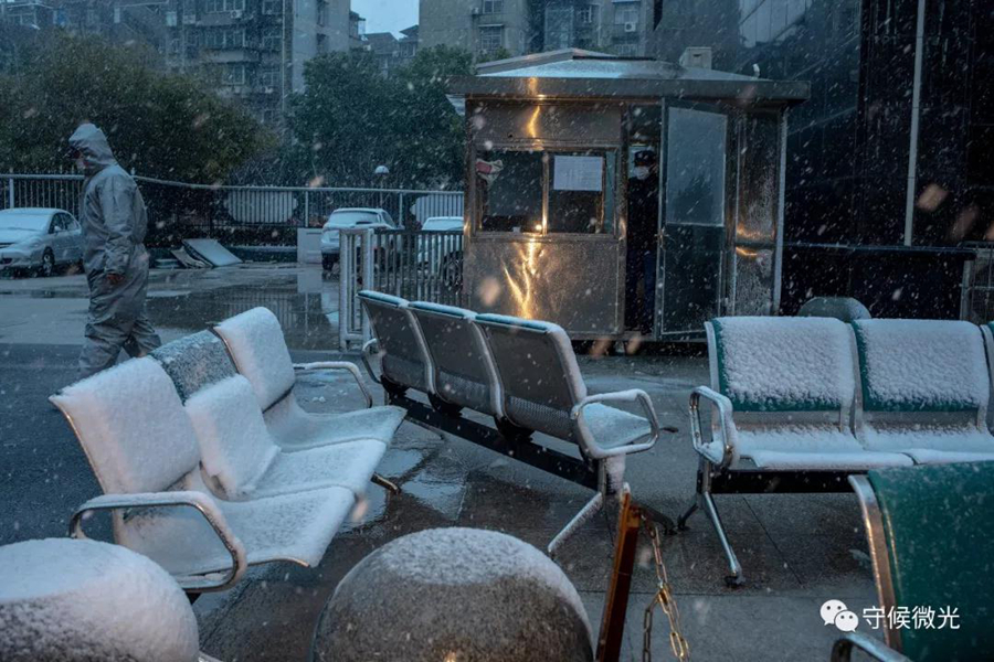 2月15日,湖北省武漢市武昌區(qū),湖北大中中醫(yī)院門前,一名工作人員經(jīng)過。椅子上已經(jīng)落了厚厚一層雪。中國青年報 李雋輝/攝