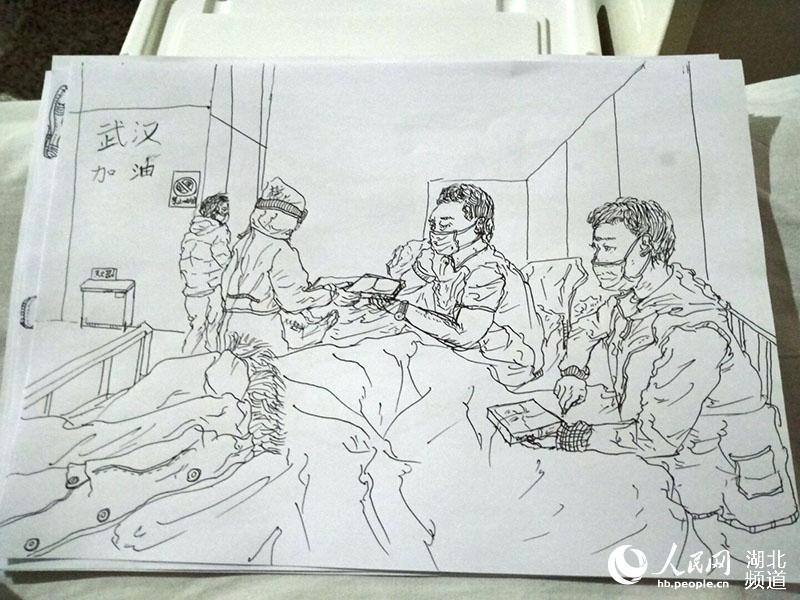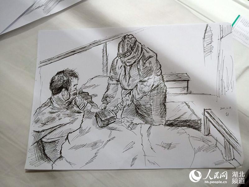 “被照顧得很好”的小彭常??吹结t(yī)護(hù)人員們穿著厚重的防護(hù)服,一忙就是6個(gè)小時(shí)以上不停歇,連水和飯都得換班以后吃,卻每天依然為患者提供無微不至的照顧。出于感動和感激,彭昕燁向醫(yī)護(hù)人員借了紙和筆,將方艙醫(yī)院溫暖的瞬間畫成素描。
