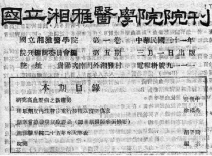 1942年3月1日《國立湘雅醫(yī)學(xué)院院刊》第一卷第五期封面;第三條為“湖南常德發(fā)現(xiàn)鼠疫經(jīng)過(譚學(xué)華醫(yī)師來函摘要)”
