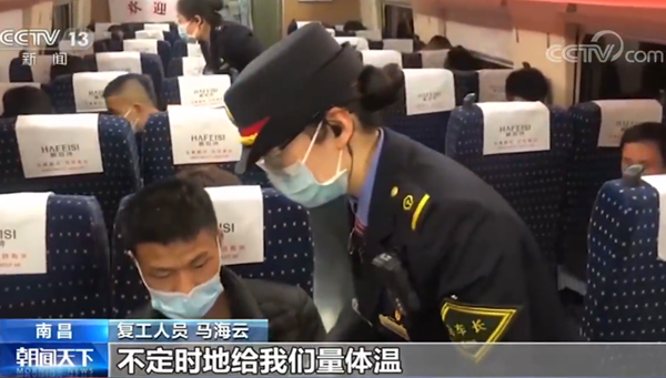 復工人員 馬海云:這一趟列車是(政府)給我們免費提供的,沒有掏一毛錢的票錢,然后列車不定時地在里面消毒,不定時地給我們量體溫,衛(wèi)生環(huán)境也很好,搞得很干凈。