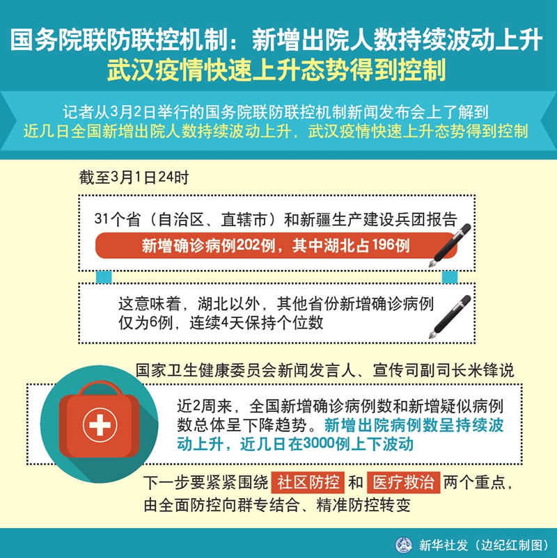? 新華社北京3月2日電(記者屈婷、周瑋)記者從2日舉行的國務院聯(lián)防聯(lián)控機制新聞發(fā)布會上了解到,近幾日全國新增出院人數(shù)持續(xù)波動上升,武漢疫情快速上升態(tài)勢得到控制。