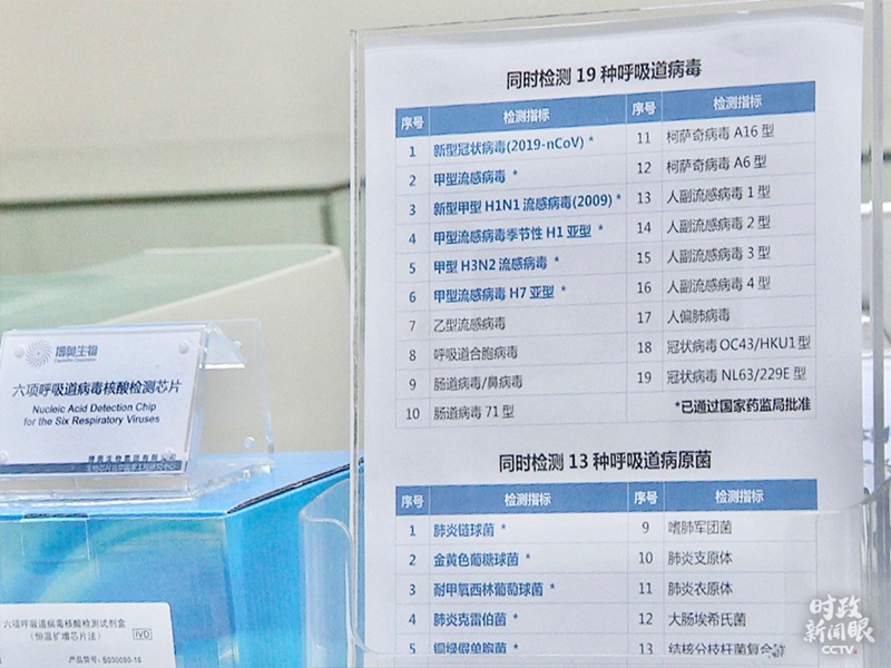 圖中藍(lán)色序號(hào)前6種呼吸道病毒,能夠被全新微流控芯片系統(tǒng)一次性檢測(cè)出來。(總臺(tái)央視記者韓銳拍攝)