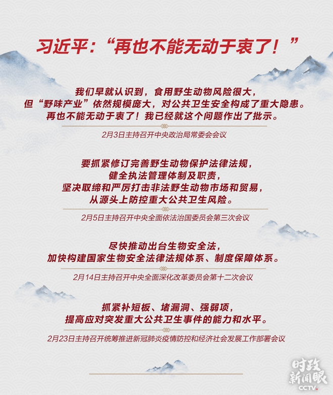 疫情發(fā)生以來,習(xí)近平不止一次談到生物安全的問題。2月14日,他在主持召開中央全面深化改革委員會(huì)第十二次會(huì)議時(shí)說,引發(fā)這次疫情的病毒,包括此前的非典、高致病性禽流感等疫情的病毒,多數(shù)病原體來自野生動(dòng)物或與之有關(guān),“必須從保護(hù)人民健康、保障國(guó)家安全、維護(hù)國(guó)家長(zhǎng)治久安的高度,把生物安全納入國(guó)家安全體系。”
