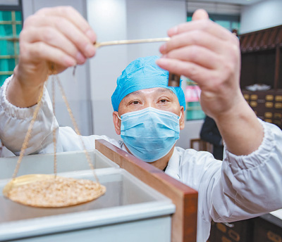 3月2日,福建省泉州市德化縣醫(yī)院的中藥師在根據處方調配中藥。邵玉姿 許華森攝影報道