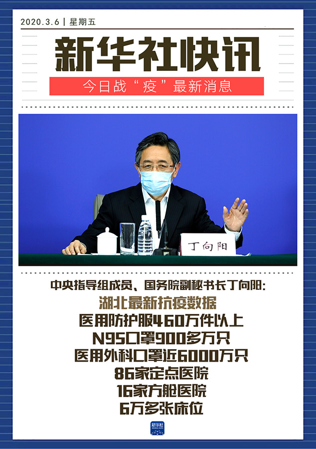 國務院新聞辦公室3月6日在湖北武漢舉行新聞發(fā)布會,請中央指導組成員、國務院副秘書長丁向陽,中央指導組成員、工業(yè)和信息化部副部長王江平,中央指導組成員、國家衛(wèi)生健康委黨組成員、中醫(yī)藥局黨組書記余艷紅介紹新冠肺炎疫情防控救治進展情況,并答記者問。