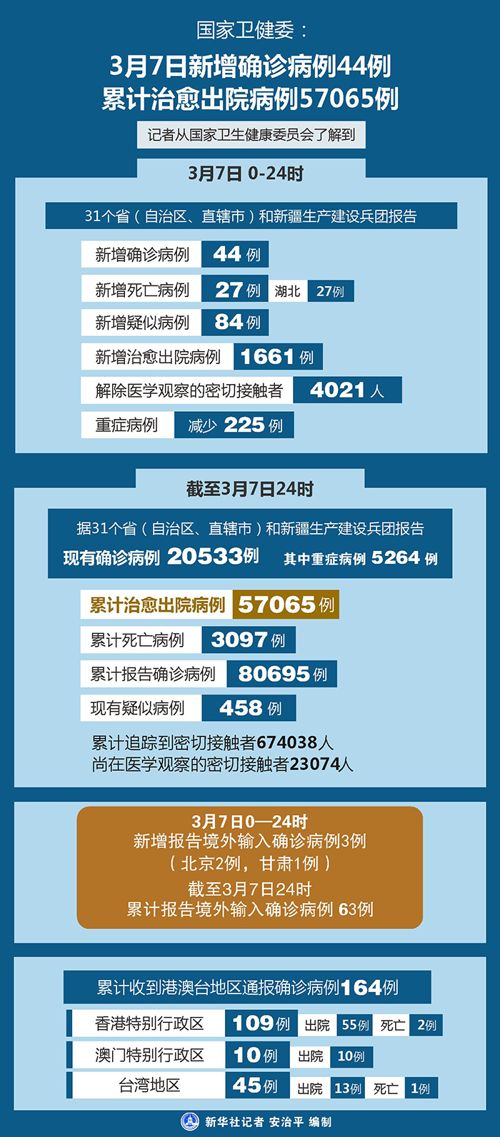截至3月7日24時,據(jù)31個?。ㄗ灾螀^(qū)、直轄市)和新疆生產(chǎn)建設(shè)兵團(tuán)報告,現(xiàn)有確診病例20533例(其中重癥病例5264例),累計治愈出院病例57065例,累計死亡病例3097例,累計報告確診病例80695例,現(xiàn)有疑似病例458例。累計追蹤到密切接觸者674038人,尚在醫(yī)學(xué)觀察的密切接觸者23074人。