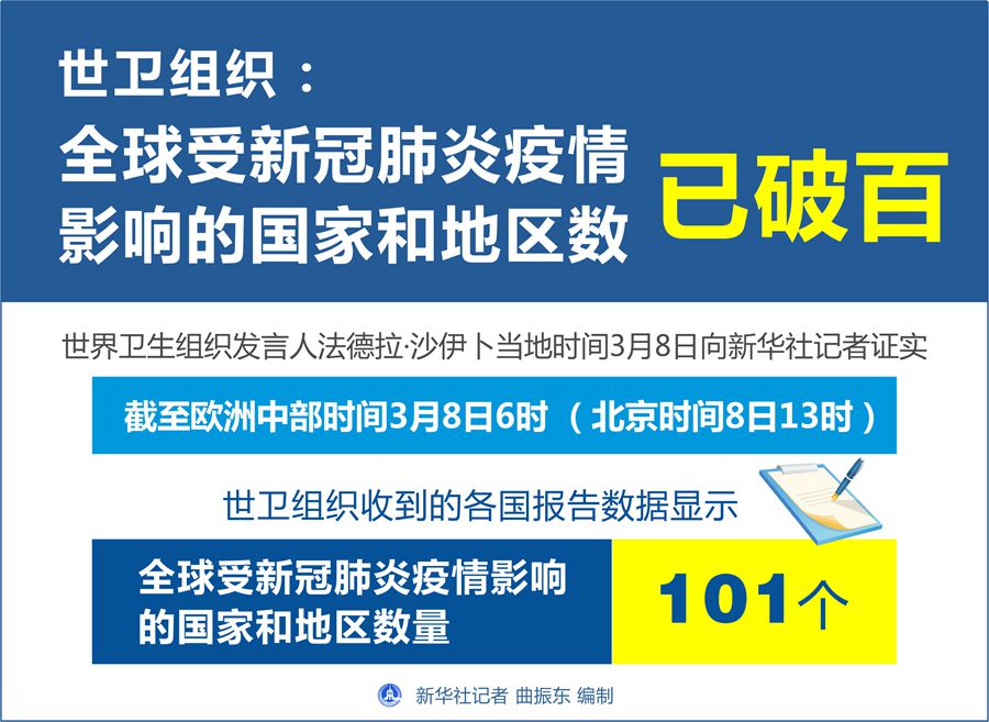 新華社日內(nèi)瓦3月8日電(記者劉曲 陳俊俠 沈忠浩)世界衛(wèi)生組織發(fā)言人法德拉·沙伊卜8日向新華社記者證實,截至歐洲中部時間8日6時(北京時間8日13時),世衛(wèi)組織收到的各國報告數(shù)據(jù)顯示,全球受新冠肺炎疫情影響的國家和地區(qū)數(shù)量已達101個。