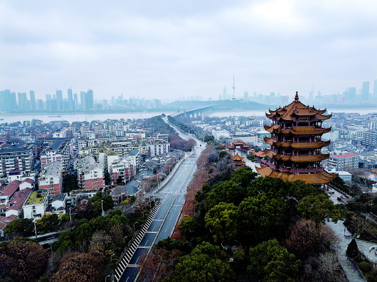 ▲1月26日拍攝的武漢黃鶴樓和長江大橋(無人機照片)。新華社記者熊琦攝