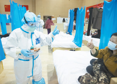 醫(yī)護(hù)人員在照護(hù)患者身體疾病的同時(shí),注意做好心理安撫工作。圖為在武漢江夏方艙醫(yī)院,湖南中醫(yī)藥大學(xué)第一附屬醫(yī)院護(hù)士長(zhǎng)涂麗(前左)與一名患者交流。