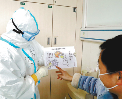 為緩解患者的焦慮情緒,在武漢大學(xué)中南醫(yī)院隔離病房,河北醫(yī)療隊(duì)護(hù)士用漫畫同患者交流。