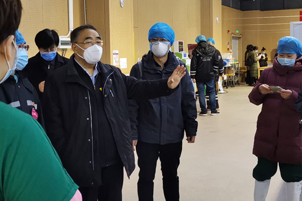 2月12日,全國(guó)人大代表、中央指導(dǎo)組專家組成員、中國(guó)工程院院士、天津中醫(yī)藥大學(xué)校長(zhǎng)張伯禮(前排左三)在湖北武漢江夏方艙醫(yī)院指導(dǎo)工作。